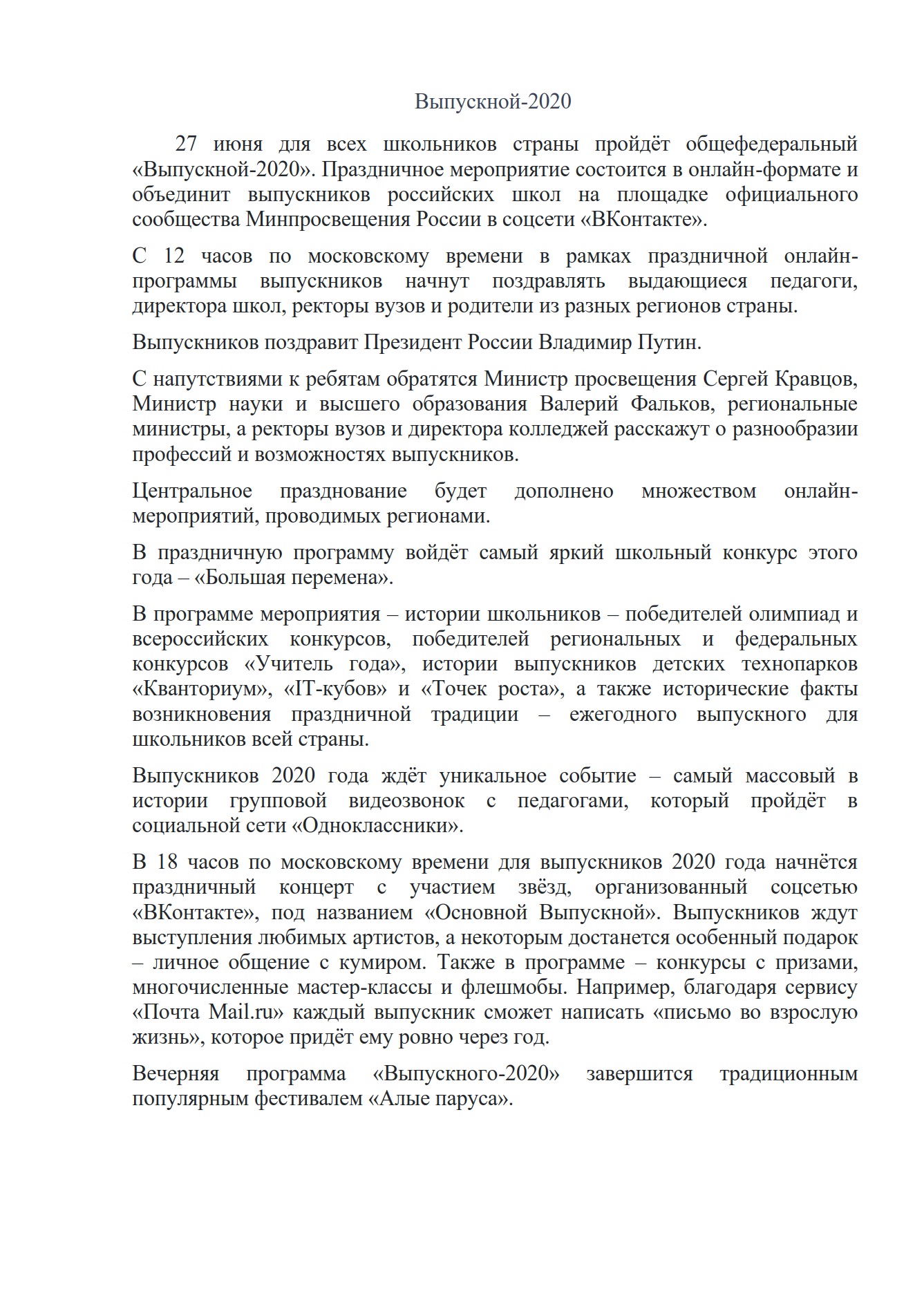 27 июня для всех школьников страны пройдёт общефедеральный «Выпускной-2020». Праздничное мероприятие состоится в онлайн-формате и объединит выпускников российских школ на площадке официального сообщества Минпросвещения России в соцсети «ВКонтакте».