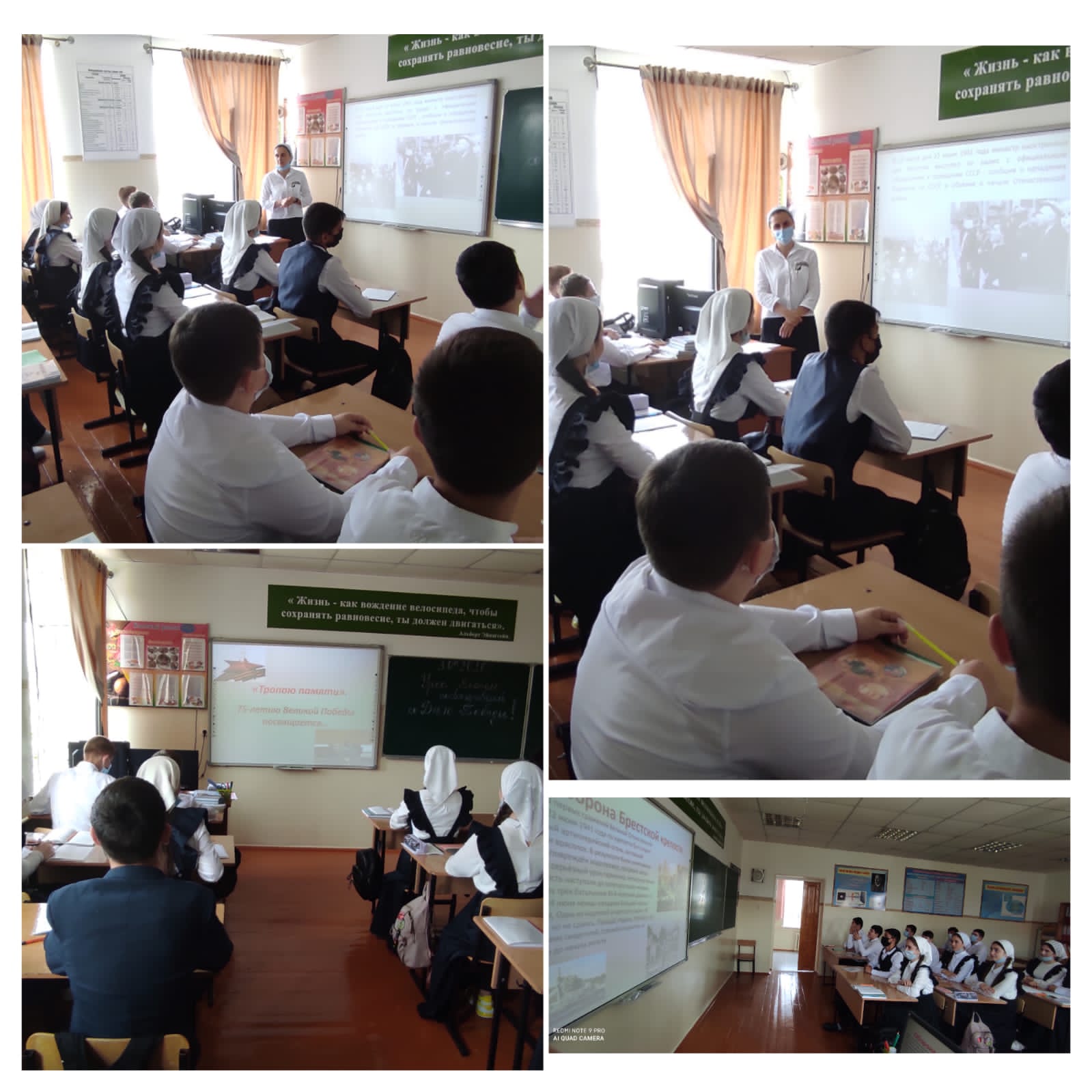 В МБОУ «Ойсхарская ОШ» учитель истории Осмаева Аминат Заурбековна провела урок Победы в 9-х классах.