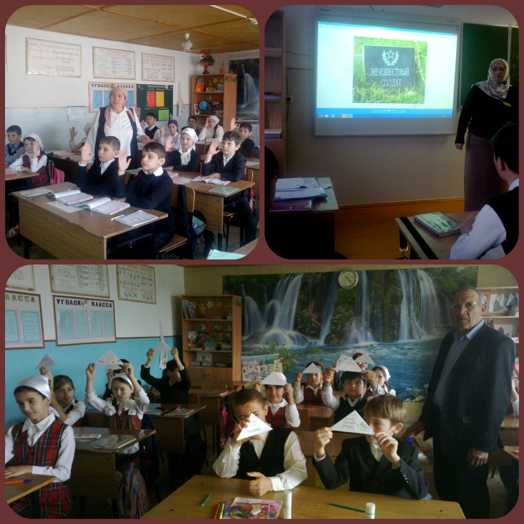 Директор школы Мадаева Мадина Абдул-Межидовна в 9Б классе начала урок мужества со слов: «Неизвестный солдат, кто он?» День Неизвестного солдата - возможность "еще раз отдать дань памяти всем тем, кто погиб на фронтах и чьи имена так и не удалось установить". Это замечательная инициатива. Все, что касается истории нашего государства нужно ценить, помнить и уважать. Это правильно. Мы не должны стесняться своих героев, своих наград, не должны забывать, какую цену мы заплатили за наши победы. Детям, подросткам каждый такой памятный день поможет помочь сформировать тот душевный стержень, который движет каждым из нас, гражданином своей страны. Это актуально сегодня, когда Россия переживет непростые политические времена. Классный час проводимый в 4 классе – «Имя твое неизвестно, подвиг твой бессмертен», к которому подготовилась Качаева Дагман Данисолтавна, был посвящён памятной дате России- Дню Неизвестного солдата. Ребята узнали о новой памятной дате – 3 декабря -День Неизвестного солдата. Познакомились с историей памятника -Могила Неизвестного солдата у стены Кремля, в Александровском саду, посмотрели фотографии других памятников, посвященных героям Великой Отечественной – Мамаев Курган, Брестская крепость.